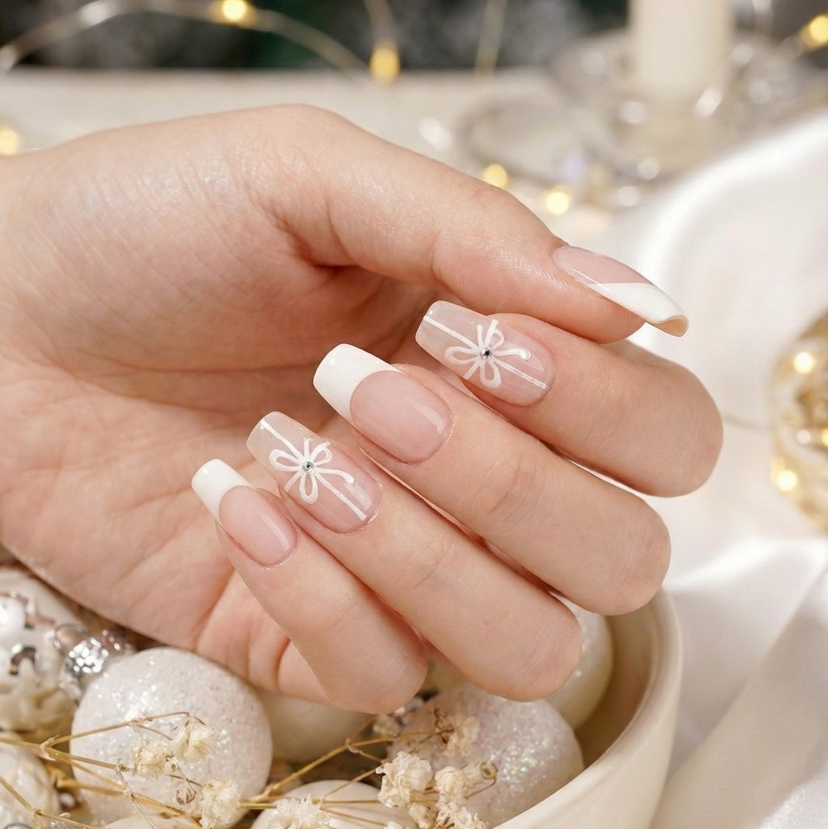 Son rose poudré délicat, sublimé par une french blanche et de jolis nœuds rappelant les rubans de cadeaux, évoque toute la magie de Noël.