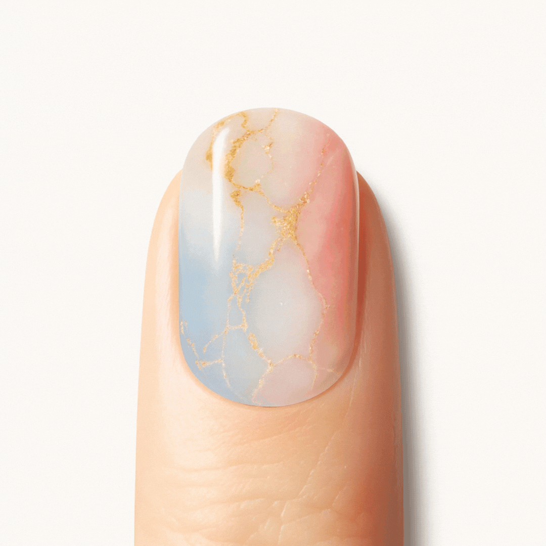 Ses nuances pastel mêlant rose, beige, bleu et doré créent un effet marbré luxueux, illuminé de fines éclats dorés pour une touche de sophistication.