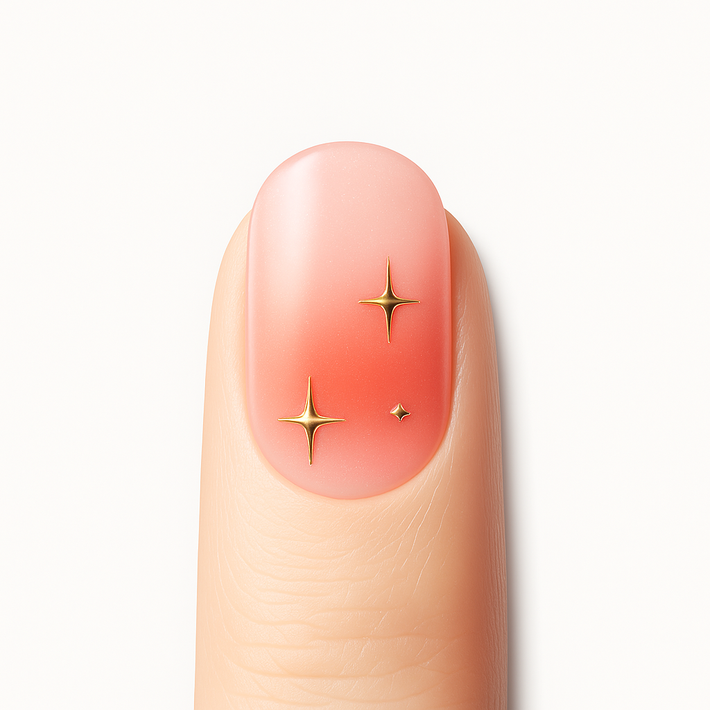 Éclats Solaires dévoile un dégradé doux corail et nude, sublimé par de fines étoiles dorées qui captent la lumière à chaque mouvement.