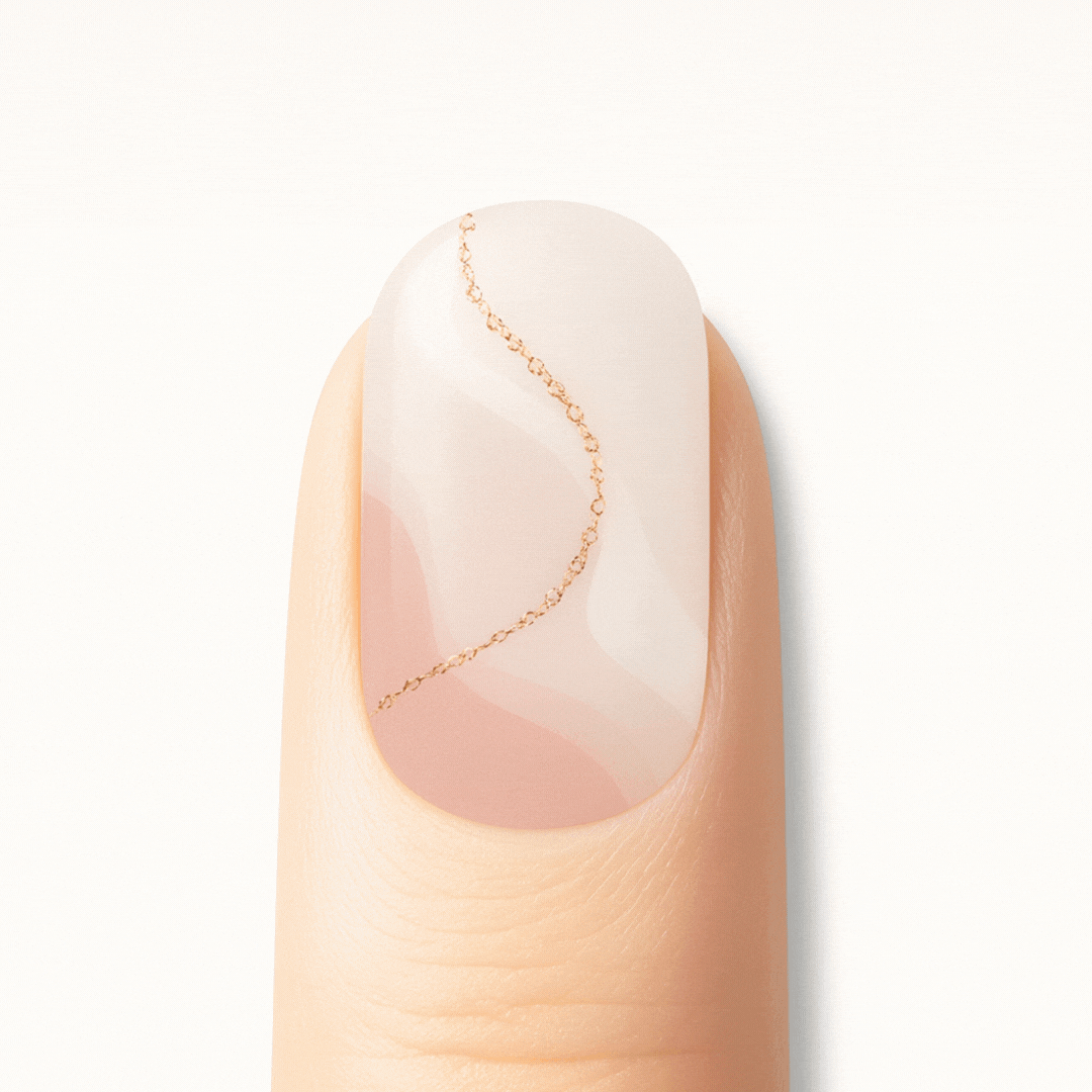 Une manucure subtile et raffinée, où les tons nude et rosés s’unissent à de délicates lignes dorées.