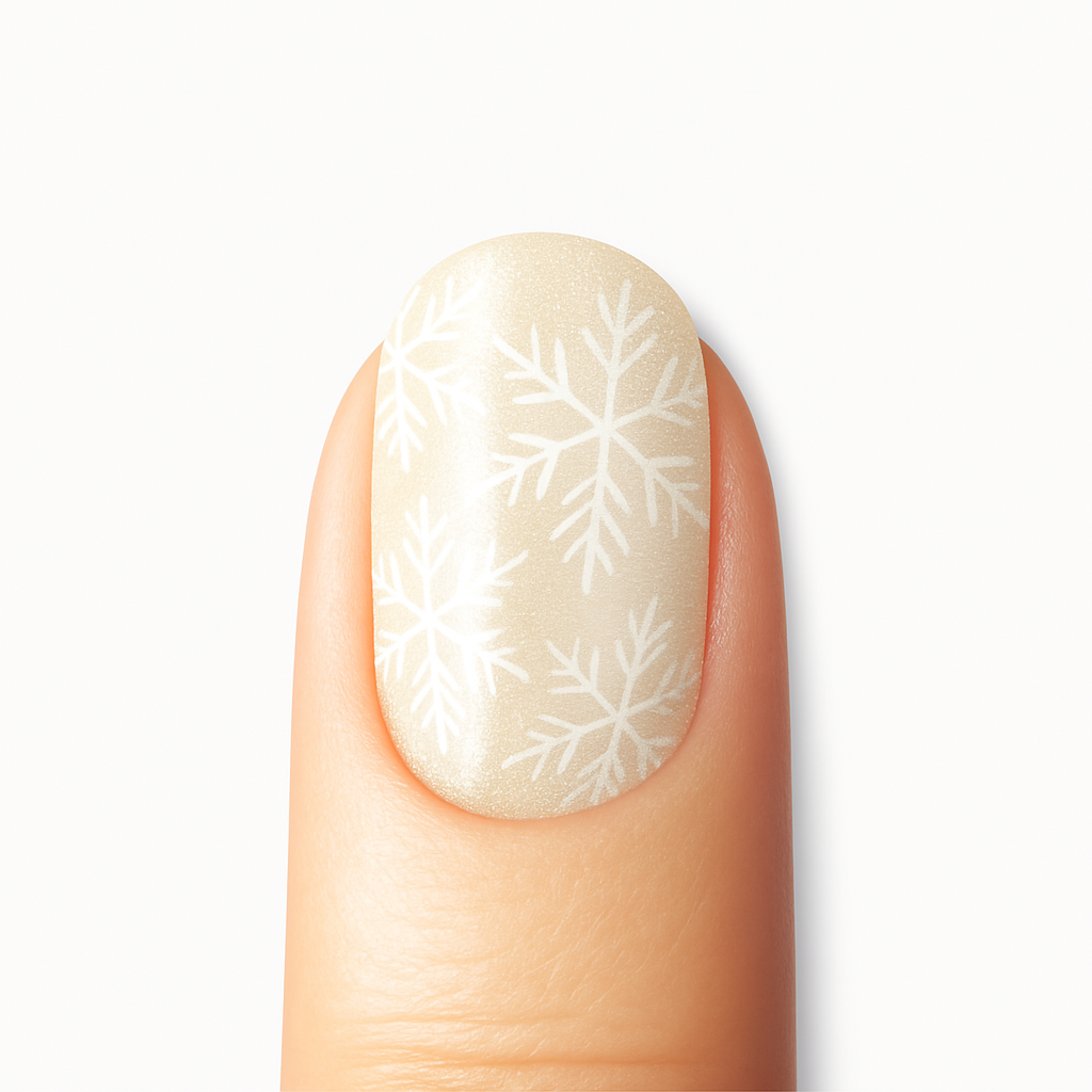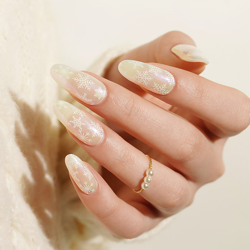 Une manucure lumineuse et raffinée, inspirée de la pureté des flocons d’hiver.