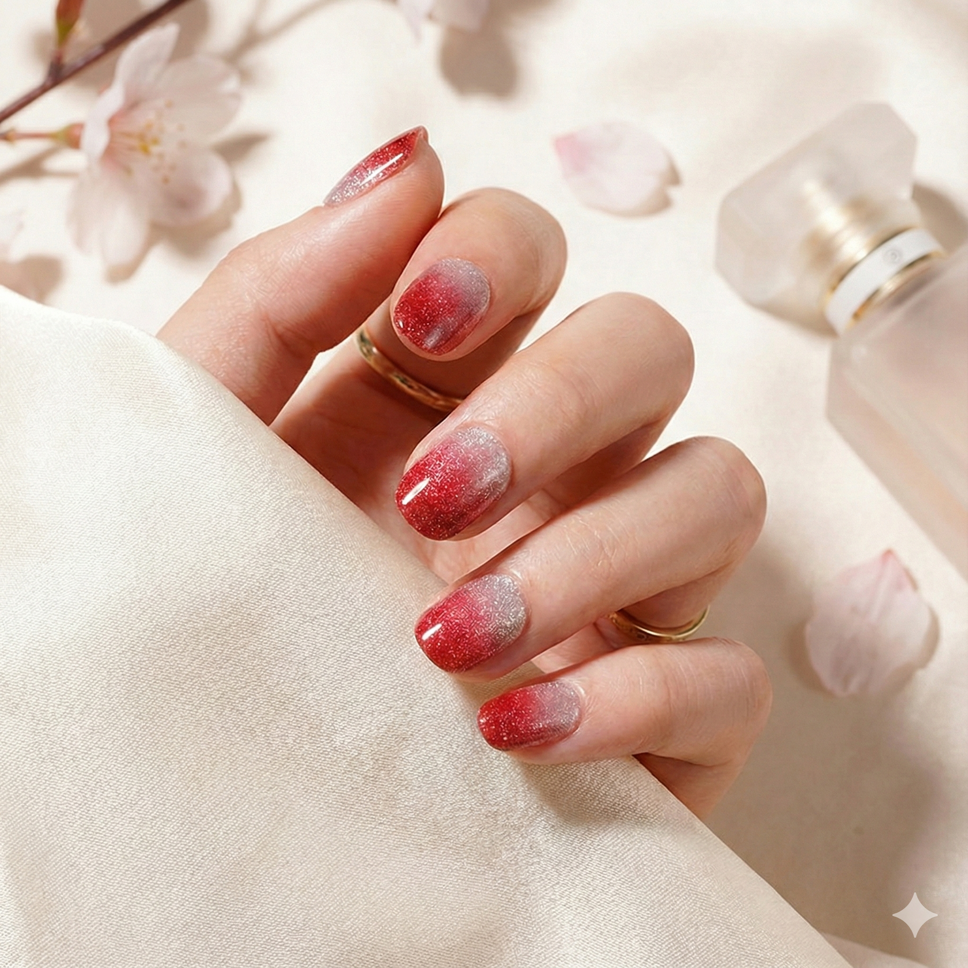 Une manucure éclatante et raffinée, où le rouge profond se fond dans un dégradé argenté scintillant.