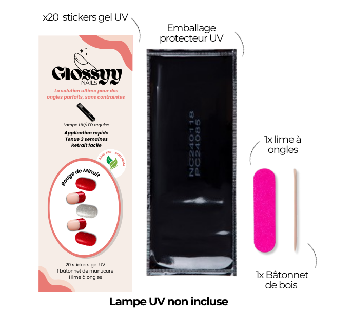 Chaque kit comprend 20 stickers gel (plusieurs tailles pour s’adapter à tous les ongles), une mini lime et un bâtonnet repousse-cuticules.